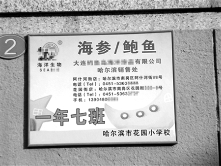 近日,记者不断接到哈尔滨市花园小学校家长反映,学校贴在临街教学楼外的班牌变了样,原来的班牌只是一张纸,现在的班牌虽然变美观了,可是班牌上多出了“海参鲍鱼”的广告。