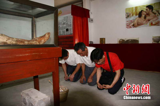2011年4月,广西梧州一家公园内展出的古尸正对着墙壁上的赤裸画。图为古尸后代在祭拜祖宗。