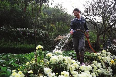 昨日上午,华西都市报记者在简阳市养马镇郊外半山腰的农家旁,见到了正在给蔬菜浇水的王周建,菜地和田间小路周围被五颜六色的菊花包围,他的老婆罗容正在另一块地里摘菜。