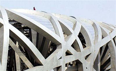 “我们的保安和消防员爬上去,想把她带下来,但她好像在躲着我们,我们从一边上去,她就跑到了另一边。”奥体中心的一名工作人员说,鸟巢上面有一处地方在施工,红衣女子很可能是买了票进入鸟巢之后,从那个地方爬上去的。