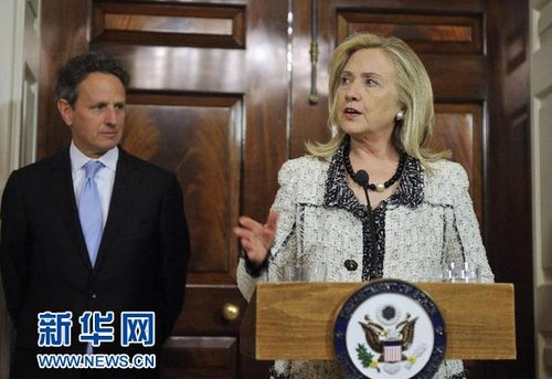 11月21日,美国国务卿希拉里·克林顿(右)和财政部长蒂莫西·盖特纳宣布对伊朗实施制裁的新措施。 新华社记者张军摄