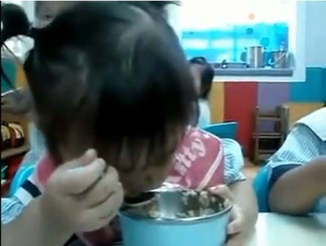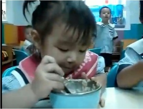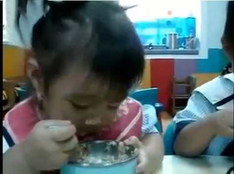在这个被广泛转载的视频中,“瞌睡妹”一开始还和小朋友们一起吃着饭,看起来大饭碗中饭已没剩多少。不过才挖了两口饭,睡意就来袭,“瞌睡妹”好努力地嚼着饭,眼皮却已经完全撑不开来。胖胖的小手还握着勺子,头却越来越低,大饭碗一倒,正好将“瞌睡妹”侧歪的笑脸整个盖了个严实。这个场景引发了两位小男孩围观,也让老师止不住大笑。老师喊了两声“瞌睡妹”的名字,“瞌睡妹”如梦初醒,挣扎着张开眼、抬起头,第一件事却是继续嚼着口中的饭粒。不过仅仅吃了两口饭,坚持了不到5秒钟,“瞌睡妹”肉嘟嘟的小脸又一次“埋”到饭碗里。
