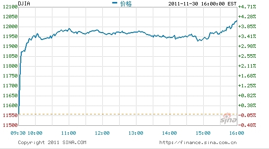 北京时间12月1日凌晨消息,周三美国股市大幅收高,道指尾盘发力一举收复12000点关口,大盘获得2009年3月以来最大单日涨幅。在欧洲债务危机威胁全球经济增长的背景下,美联储联手其他五家央行向遭受欧债危机打击的银行提供流动性支持,提振了市场信心。