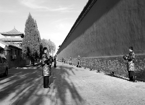 宫内城墙脚下的过道两侧,每隔十米左右站立着一个身着铠甲手持盔帽的“御林军”。