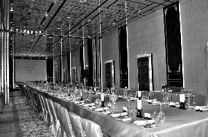 金碧辉煌的宴会厅内,摆着长形餐桌,上面放好中西餐具。