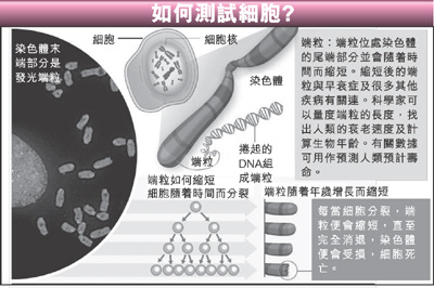 据悉,这项测试由西班牙国家癌症研究中心的布拉斯科发明,通过测量人类染色体末端称为“端粒”的部分,准确显示出人类衰老的速度。量度“端粒”的长短并经过测试后,可以得出人类的“生物年龄”,与实际的年龄作比较。