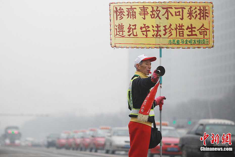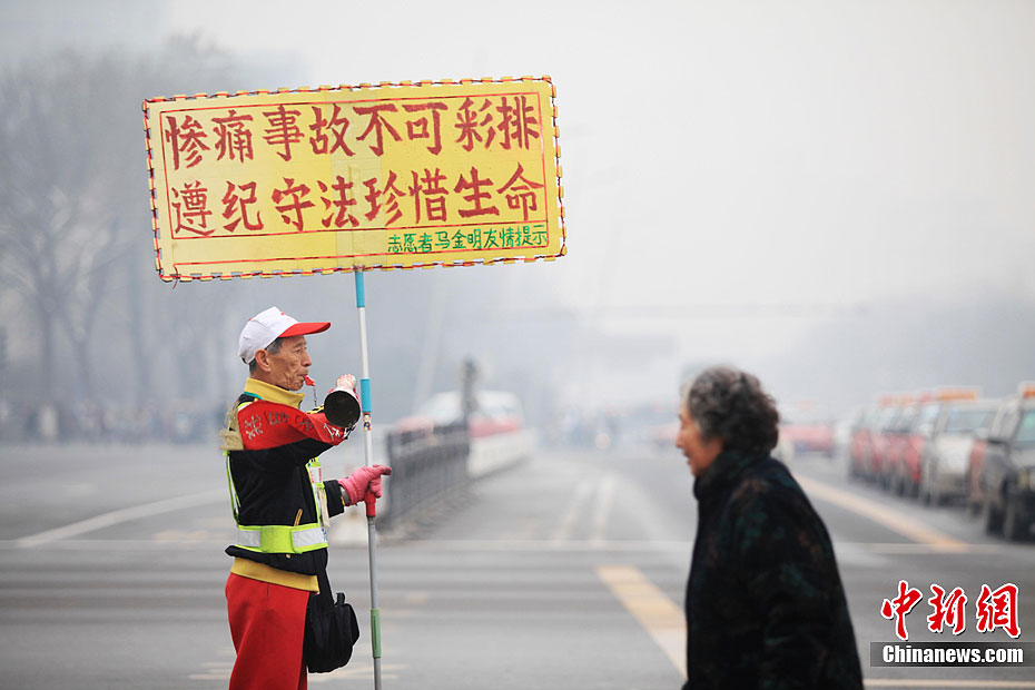 12月5日,在山西太原街头,人称“最美老翁”的马金明老人在大雾中义务疏导交通。当日,中国华北等地大雾弥漫,中央气象台当日06时继续发布大雾蓝色预警。中新社发 韦亮 摄