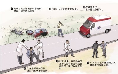 救护车于20分钟后到达现场,随后伤者被送往县中医院急诊科,经普外科、口腔科会诊,发现伤者不能言语、精神异常,且不配合医师检查,导致无法对其进行CT头部扫描,考虑到伤者伤口已化脓感染,不能一期缝合,给予伤口清创、消毒、换药,并予以静脉输液抗炎治疗。因伤者身上无任何能证明其身份的物件,医师只能将其安置于急诊科。20日,伤者已能下床活动,但仍然不能言语,精神异常,多次睡到他人病床,随地大小便,遭到同科室病友的多次投诉。22日凌晨1时左右,急诊科当班医护人员将伤者干扰医疗秩序一事报告给保卫科,要求保卫科人员尽快处理此事。