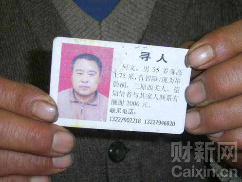 2010年6月,何文走丢了。他是被一个电话叫走的。一个女人对他说,有一份工作,包吃包住,一天给70块钱,还给一两包烟。他骑着自行车乐呵呵就出了门。
