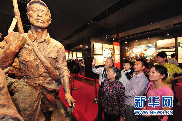 5月12日,在贵州遵义会议会址,来自江西的高先生(右二)一家在陈列馆观看“喜迎红军进遵义”浮雕。 新华社记者 杨楹 摄