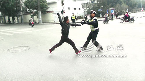 “出于取证需要,在路面检查时我们都会拍摄相关视频,整个事发过程有视频为证。”当事交警是南昌市西湖交警三中队民警王建军。他指着屏幕向记者介绍,昨日中午12时50分许,他和同事林万云及几名协管员在事发路口执勤,这时一辆红色踏板式摩托车驶来。当时路口亮红灯,摩托车似要拐向广场东路,没有减速之意。眼见这辆按规定根本不允许上路的超标摩托车想闯红灯,王建军等人急忙上前制止。
