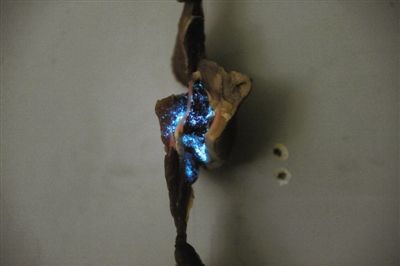“墙边蓝莹莹的一片,朦朦胧胧的,很瘆人,我吓得赶紧开灯,灯亮了,发光处只有那块猪肉在那挂着。”李先生叫醒妻子,重新关灯,才发现发出蓝光的正是那块猪肉。