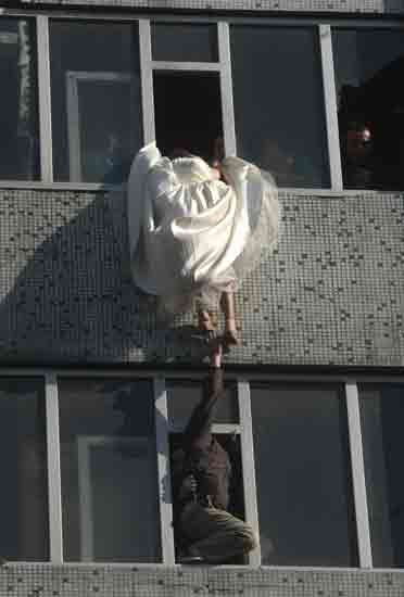 16时21分28秒,“跳了”,随着一声惊呼,李某一用力从窗口跳了下去。就在人们为李某的安危担心时,从七楼的窗户里一只右臂突然伸出,一把搂住了李某的脖子,左手则伸出来拽住了婚纱。原来,郭中凡看准情形,一个箭步跨了上去,在李某的身体没下落之前拽住了她。由于用力过猛,郭中凡的上半身磕在了窗户上,发出了“哐”的响声,之后也探出了窗口。