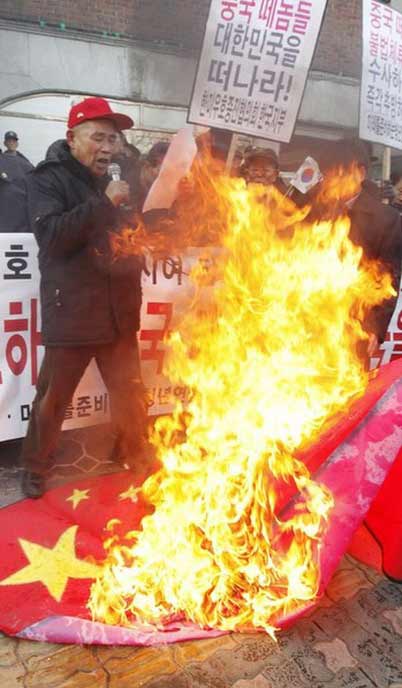 韩国示威者在街头焚烧中国国旗,高举标语“中国人是杀人犯,离开韩国”