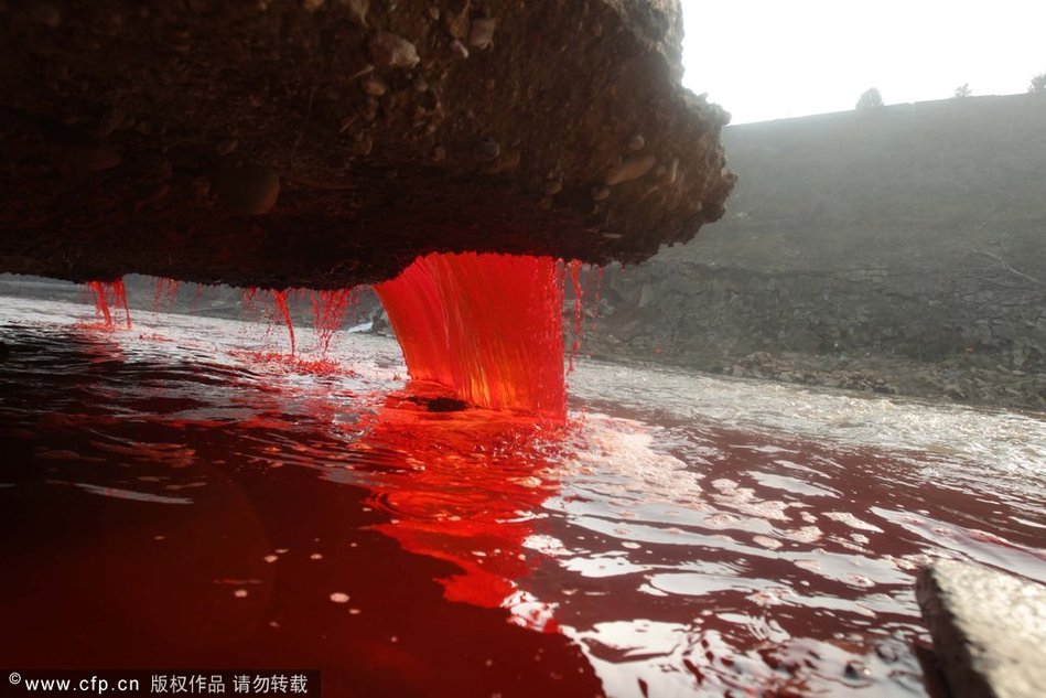 2011年12月13日,洛阳涧河遭到污染,河水变成血红色,穿越市区后流入洛河。次日,洛阳市环保局经过排查,确认源头是两家非法作坊,生产污水直接排放进雨水管网,并流入涧河染红河水。当日,这两家非法作坊被取缔。14日,这两家非法作坊被取缔。图为记者在华山路涧河桥下采集河水水样。