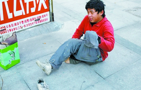他掏出打火机点了几次才把烟点着。然后,记者要求他表演把腿藏进裤管内扮成残疾人乞讨。他见记者并无恶意,笑了笑便把左脚上的破球鞋脱掉,坐地上眨眼间脱掉左腿上的外裤,双手扳住左脚把小腿与大腿折叠起来,把左脚垫在屁股下面对记者说:“就是这样。”
