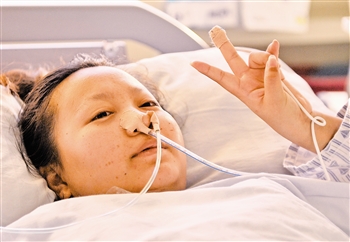 记者在ICU病房见到了杨蓉,她的身体虽显虚弱,但精神很好,对着镜头做出了胜利的手势。