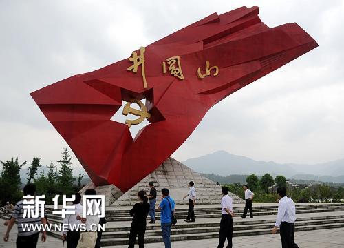 4月29日,游客参观“井冈红旗”雕塑。“五一”小长假来临之际,前来江西井冈山参观和感受红色文化的游客络绎不绝。今年是中国共产党建党90周年,以红色旅游为主题的江西旅游市场格外红火。新华社记者 周科 摄