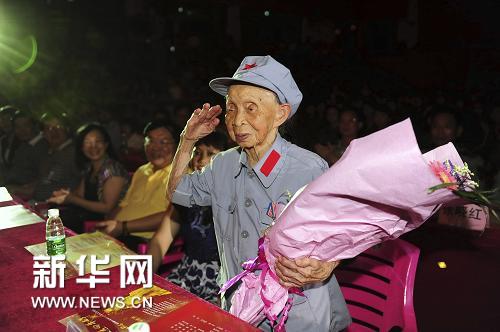 5月4日,101岁的海南岛琼崖纵队娘子军老战士王运梅向观众敬礼。当晚,“永远的丰碑——琼海市纪念红色娘子军成立80周年”文艺晚会在琼海市嘉积中学少年文化宫举行,以纪念海南岛琼崖纵队娘子军成立80周年。据琼海民政部门介绍,目前健在的娘子军老战士仅剩下3名。新华社发(蒙钟德 摄)