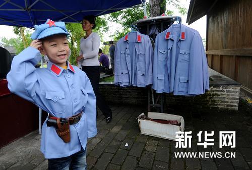 一位小朋友在瑞金市叶坪革命旧址群穿上红军服拍照(5月1日摄)。“五一”小长假期间,江西瑞金市共接待国内外游客10.2万次,同比增长36.2%。瑞金是享誉中外的“红色故都”,中华苏维埃共和国临时中央政府诞生地,红军二万五千里长征出发地,是全国革命传统教育名城。新华社记者 周科 摄