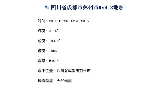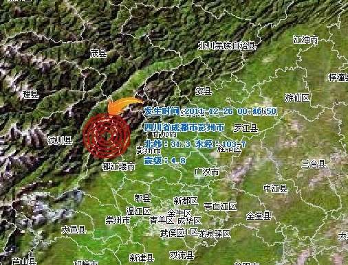 据地震台网测定,北京时间2011-12-26 00:46:50 在四川省成都市彭州市(北纬31.3,东经103.7) 发生4.8级地震,成都市区有明显震感。