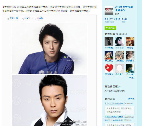 26日19时,2012央视春节联欢晚会官方微博公布了李玉刚韩庚确定加盟龙年春晚的消息,李玉刚本人微博也转发该微博表示一直梦想上春晚,5年来从未停止前进的步伐,首次获得春晚邀请最应该做的事是“冷静”。相比第二次参加春晚的韩庚微博言语则轻松许多,他承诺将有惊喜创意带给大家。
