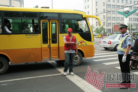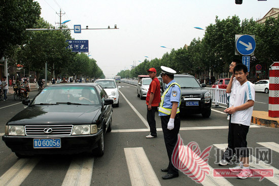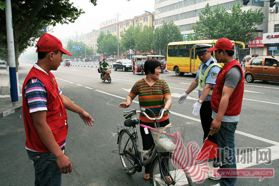 5月19日,两名身穿红色马甲、头戴小红帽的志愿者,在路口和交警认真劝导一位直行信号灯亮时候欲左转弯的妇女。为进一步在城区深化“文明交通行动计划”,广泛营造“文明交通,从我做起”的宣传氛围,5月6日起,临沂市费县交警大队组织辖区青年志愿者走上街头,担当交通义务劝导员,协助民警维护交通秩序,纠正行人、非机动车驾驶人不文明交通行为。