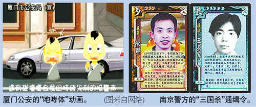 上半年,上海警方率先用一则凡客体的“追缉令”称呼逃犯为“亲”,规劝其“告别日日逃,分分慌,秒秒惊的痛苦”,并呼吁他们拨打电话来“赶紧预订喔!”北京、南京等地也先后推出各种版本的“追缉令”。