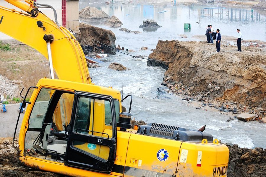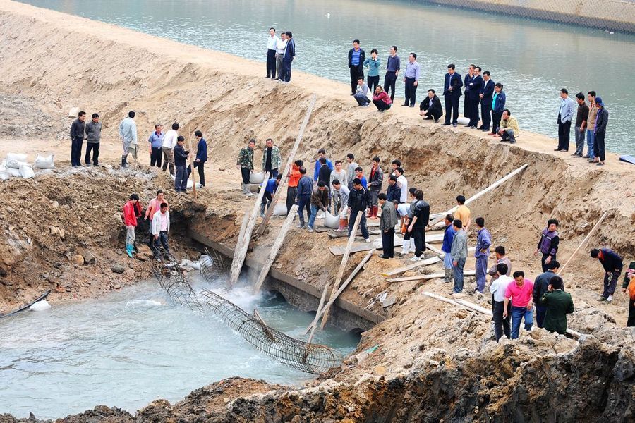 建筑工人正在合力堵住海水入口