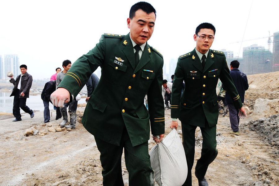 边防官兵帮助工人封堵海水入口
