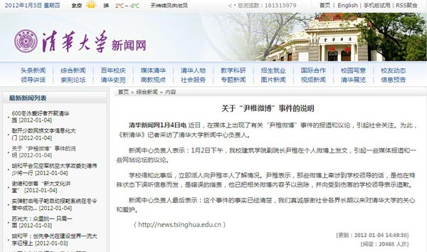 新闻中心负责人表示:1月2日下午,我校建筑学院副院长尹稚在个人微博上发文,引起一些媒体报道和一些网站论坛的议论。