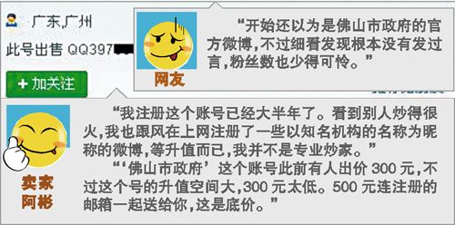 "佛山市政府’这个账号此前有人出价300元,不过这个号的升值空间大,300元太低。500元,我连注册的邮箱一起送给你。”阿彬向记者亮出了底价。不过,作为一个从没卖出过账号的业余炒家,他甚至不明白怎样进行交易,“我要想想怎么卖给你。”