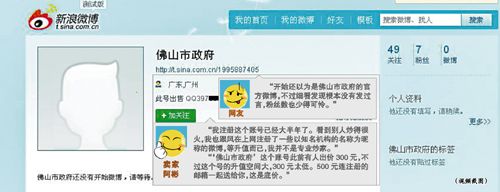 昨日,有网友向本报报料,在微博上发现了一个“佛山市政府”的账号。记者搜索发现,该账号确实存在,截至昨日仅有7个粉丝。 该账号的说明上还明确说账号可以出售,并留下了QQ号码。