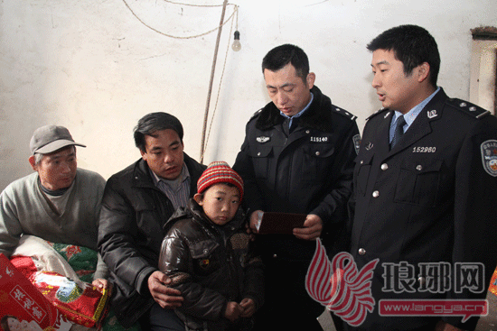 2012年1月8日上午,费县梁邱镇蒋家围子村蒋加奎家来了一伙特殊的客人----费县公安局梁邱派出所的民警。他们不仅为瘫痪在床的蒋加奎送来了过节的礼品,而且还带来了让他期待已久的喜讯:他10岁的儿子蒋永越终于落上户口了。10年前,蒋加奎在外地打工时认识了妻子李某,并且未婚生下了儿子蒋永越。一场意外,让蒋加奎下肢瘫痪,长期卧床,妻子李某看到生活无望,也离家出走,一去不返。蒋加奎和蒋永越只能依靠亲友以及好心人的救助维持生活,而蒋永越的户口也因为没有人过问以至一直没有落上。费县公安局梁邱派出所民警“三访三评”工作中了解到这一情况后,及时调查了解,并且上报县局,及时为蒋永越落上了户口。图为派出所民警向蒋加奎一家送去过节的礼品和户口本。