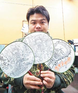 “没办法?我只有硬着头皮画”,专门替客人手绘的摊位师傅谢立圣笑说,日前一位年轻游客看到他在画扇子,就来到摊前突然说“师傅!可以画日本牛仔裤上的‘鬼洗’吗?”他愣了一下,心想鬼洗是什么东西?要怎么画?只好按自己的意思画出来。