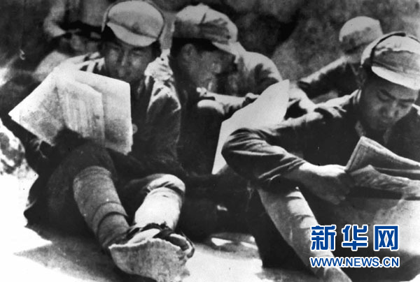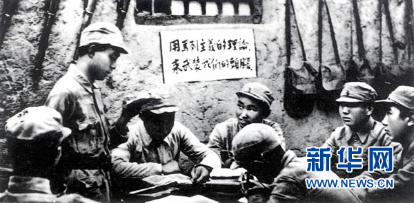 这是战士们在进行整风学习(资料照片)。 1945年4月23日至6月11日,中国共产党第七次全国代表大会在陕北小山村——杨家岭召开。毛泽东在会上致开幕词和闭幕词,并作了《论联合政府》的政治报告。七大确定了党的政治路线,确立毛泽东思想为党的指导思想并写入党章。七大总结中国新民主主义革命20多年曲折发展的历史经验,克服党内的错误思想,使全党特别是党的高级干部对中国民主革命的发展规律有了比较明确的认识。它为党领导人民去争取抗日战争的胜利和新民主主义革命在全国的胜利,奠定了政治上、思想上和组织上的深厚基础。新华社发