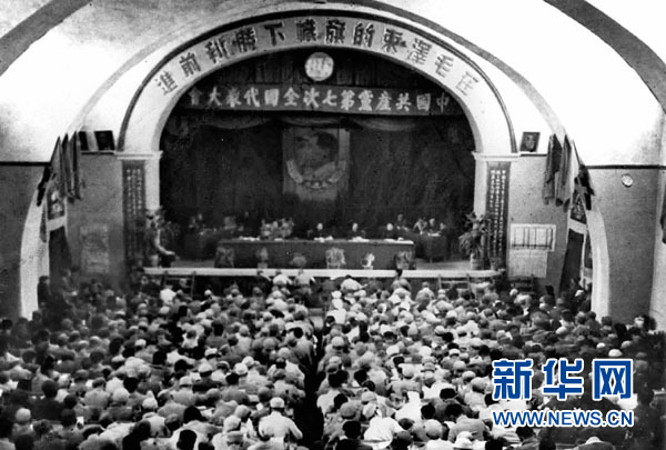 毛泽东、朱德在中国共产党第七次全国代表大会主席台上(资料照片)。 1945年4月23日至6月11日,中国共产党第七次全国代表大会在陕北小山村——杨家岭召开。毛泽东在会上致开幕词和闭幕词,并作了《论联合政府》的政治报告。七大确定了党的政治路线,确立毛泽东思想为党的指导思想并写入党章。七大总结中国新民主主义革命20多年曲折发展的历史经验,克服党内的错误思想,使全党特别是党的高级干部对中国民主革命的发展规律有了比较明确的认识。它为党领导人民去争取抗日战争的胜利和新民主主义革命在全国的胜利,奠定了政治上、思想上和组织上的深厚基础。新华社发