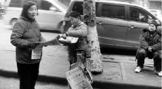 “卖报、卖报!叔叔阿姨,买份报纸看吧?”昨日上午,在硚口区崇仁南路上,一位稚气的“小报童”在两名花甲老人的陪伴下在路边兜售报纸。
