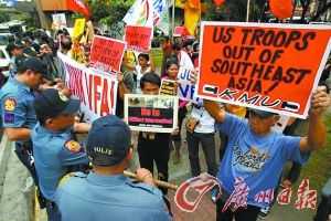 此外,还有约50名菲律宾左翼的“新爱国联盟”成员举着巨大的“山姆大叔”以及菲律宾总统阿基诺的人物模型试图靠近美国大使馆,但遭到了菲律宾防暴警察的阻拦。