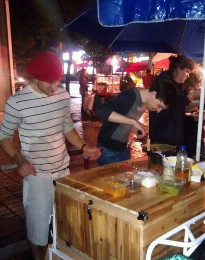 说起Benoit和Julien摆摊的原因,其实很简单。他们来上海后看到晚上校门口卖吃的摊位很多,一时 突发奇也想卖薄饼。这种食物简单易做,也有法国特色。两人先花费一下午准备面粉、水果等素材,7时准时出摊。首次尝试后一炮而红,第一天就赚了不少钱。