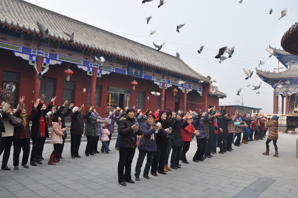 寺院从市场上买来80只频临宰杀的鸽子,释隆庆法师带领诸位居士信众按照放生仪轨为它们进行了祈福,然后将它们全部放飞。香客的虔诚,游人的风采,为寺庙增添了特有的魅力。在家长的带领下,许多小朋友参加了这次有意思的活动,将爱护生命的种子从小播在了心田。
