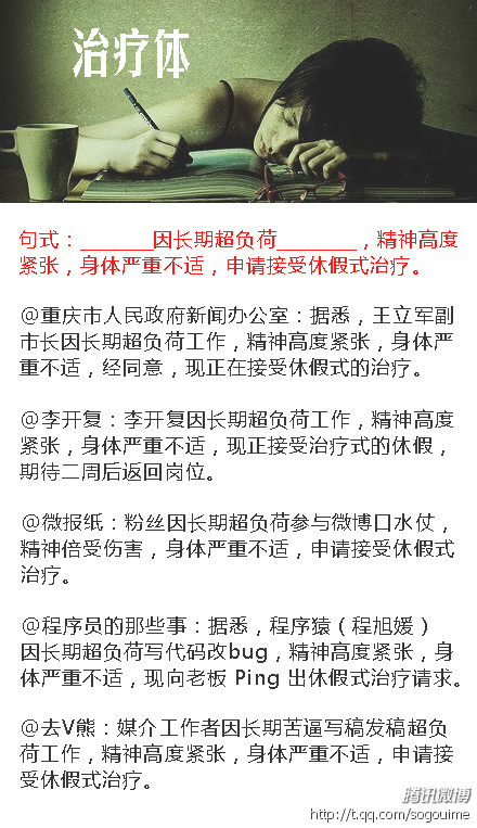 临沂网讯 治疗体—源自@重庆市政府新闻办 一则微博:据悉,王立军副市长因长期超负荷工作,精神高度紧张,身体严重不适,经同意,现正在接受休假式的治疗。网友纷纷跟风效仿求"休假式治疗",句式如下:() 因长期超负荷(),精神高度紧张,身体严重不适,申请接受休假式治疗。