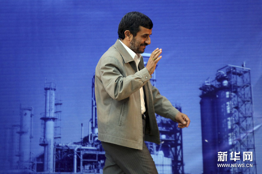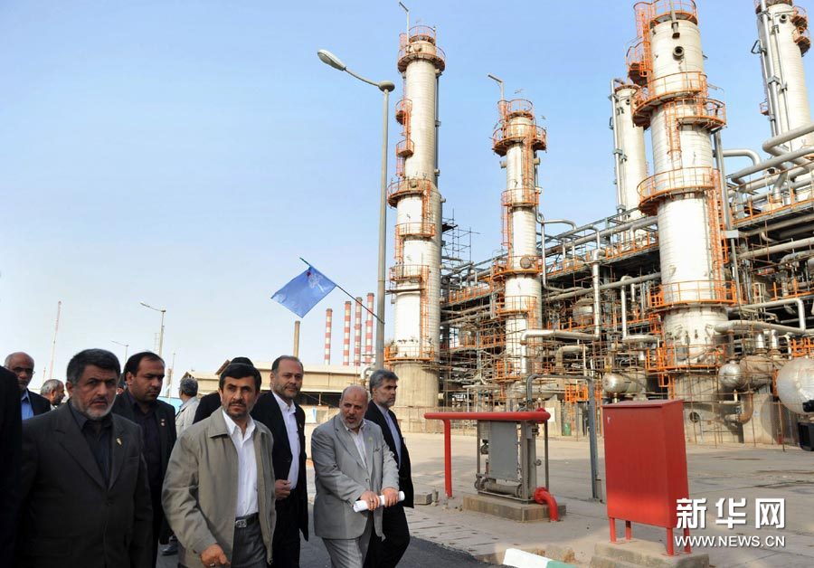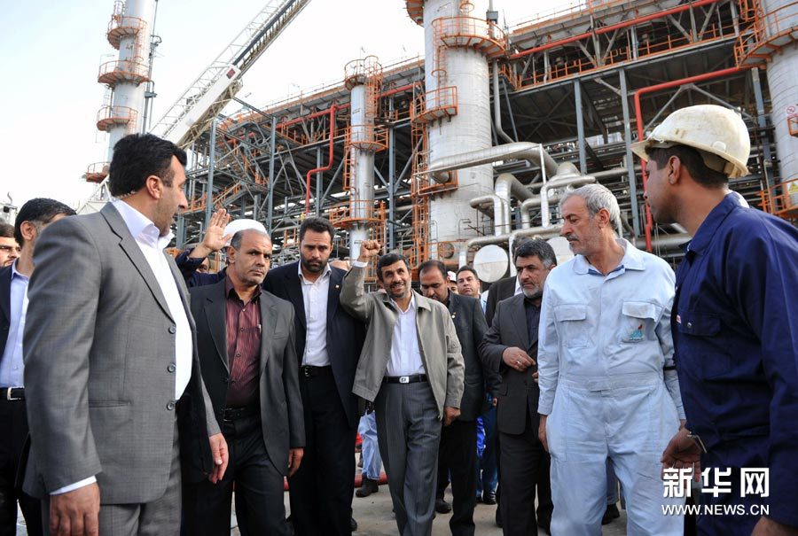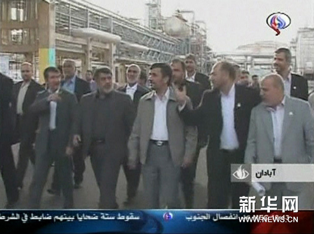 5月24日,伊朗总统艾哈迈迪-内贾德(中)在伊朗西南部的阿巴丹炼油厂考察。新华社/法新