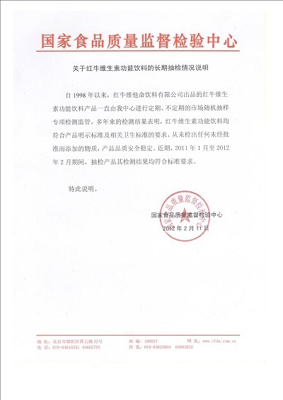 根据红牛公司提供的国家食品质量监督检验中心的情况说明显示,红牛维他命饮料有限公司出品的红牛维生素功能饮料所生产的红牛维生素功能饮料自1998以来就一直由该中心进行定期、不定期的市场随机抽样,专项检测监管,多年来的检测结果表明,红牛维生素功能饮料"均符合产品明示标准及相关卫生标准的要求"。同时,说明表示"近期,2011年1月至2012年2月期间,检测产品及检测结果均符合标准要求。
