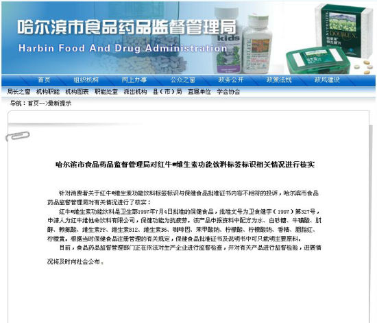 哈尔滨市食品药品监督管理局11日下午公布对红牛公司的标识相关的核实情况发表声明,表示"根据当时保健食品注册管理的有关规定,保健食品批准证书及说明书中可只载明主要原料。"