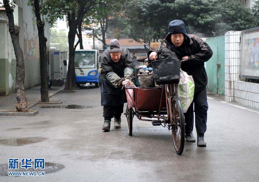 2月14日早晨,伏万祥(左)和他的儿子推着装满烤梨器具的三轮车走出小区,准备出摊做生意。近日,南京年近九旬“烤梨爷爷”伏万祥坚持自食其力的故事被热心网友发到网上,引起热烈反响,数千网友积极评论,呼吁大家照顾老人的生意并抒发自己的感动和敬佩。