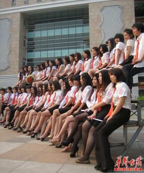 “华师惊艳毕业照”的确不同凡响。照片中,36名女生除7名女生着长裤之外,均脚穿高跟鞋,身着黑色短裙、白色衬衣、红色领带,还有人还穿上了“黑丝”,清一色“都市白领丽人”装扮。令人啼笑皆非的是,绝大多数女生的左肩还特意别上了一道亮眼的“六道杠”肩章。