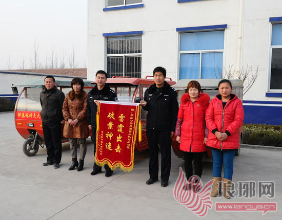 受害群众送罗庄公安分局刑警大队和义堂派出所民警锦旗并合影留念。