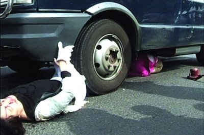 在运钞车的左前轮处,一位黑衣中年女子口鼻出血,仰面躺在马路上,话都说不出来。而一名穿粉红色上衣的中年女子,被运钞车撞倒后卷进车肚油箱下,由于车肚油箱下空间狭小,其双腿直伸,面部朝下紧贴双腿,场面非常惊险。数十市民根本无法将其拉出车底,赶到现场的急救人员也是束手无策,只能不停安慰车下女子不要喊叫,以免过度消耗体力。