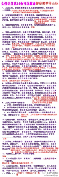 记者昨天在微博上看到,“江宁公安在线”写道:明天就是3.8女生节了,一直以来,有一个“女生记住这14条可以救命”的帖子在网上流传,以前警察蜀黍就说过,这个帖子有部分内容是不正确的,甚至是致命的。值此3.8女生节即将来临之际,把“女生记住这14条可以救命(警察蜀黍修正版)”给各位女生们御览,学点安全知识绝对是艺不压身啊。